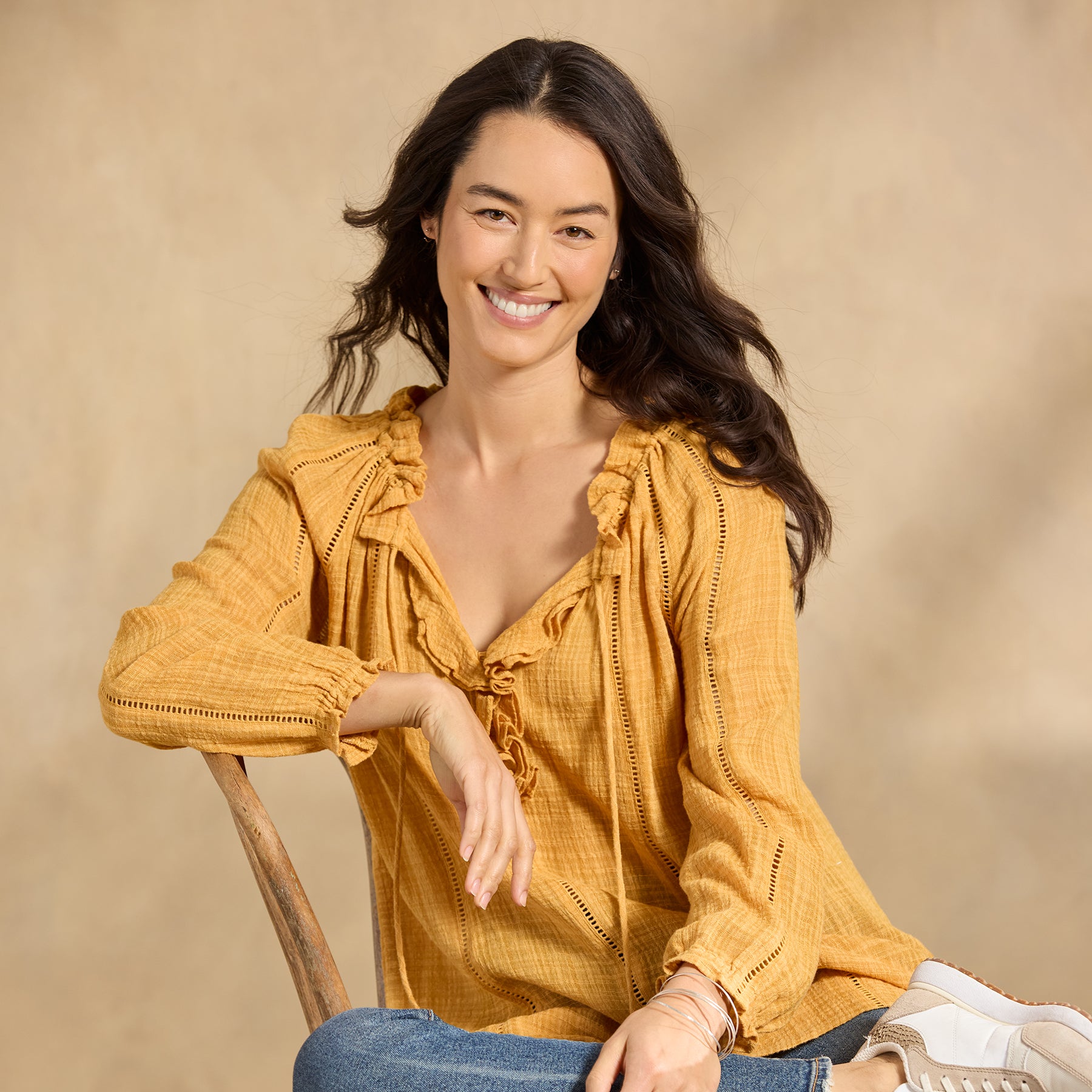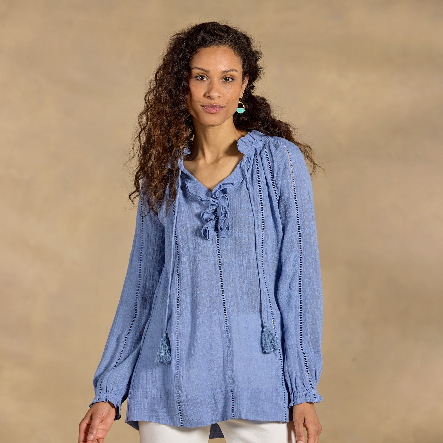 Embrace your artistic spirit in our sheer. easy-fit top with ladder lace. ruffle neckline and tassel ties. Cotton/viscose. Hand wash. Imported. Exclusive. Sizes XS (0?C2). S (4?C6). M (8?C10). L (12?C14). XL (16?C18). XXL (20?C22). Approx. 26.5l