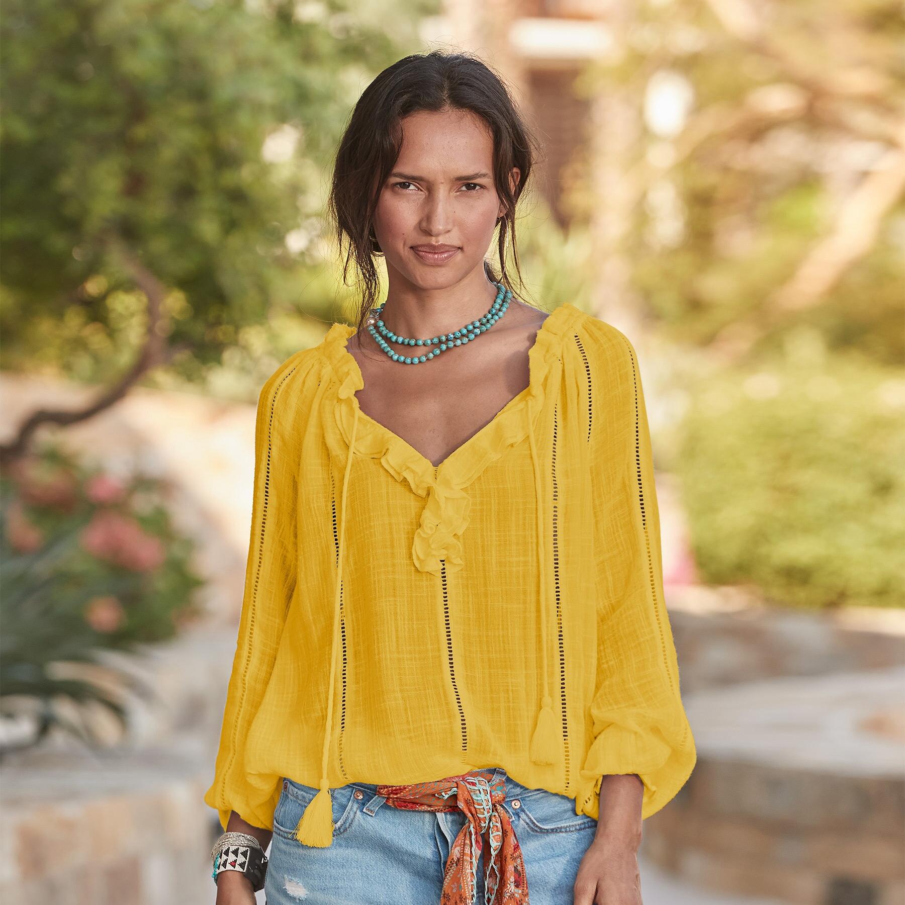 Embrace your artistic spirit in our sheer. easy-fit top with ladder lace. ruffle neckline and tassel ties. Cotton/viscose. Hand wash. Imported. Exclusive. Sizes XXS (00). XS (0 to 2). S (4 to 6). M (8 to 10). L (12 to 14). XL (16 to 18). Approx. 25L.
