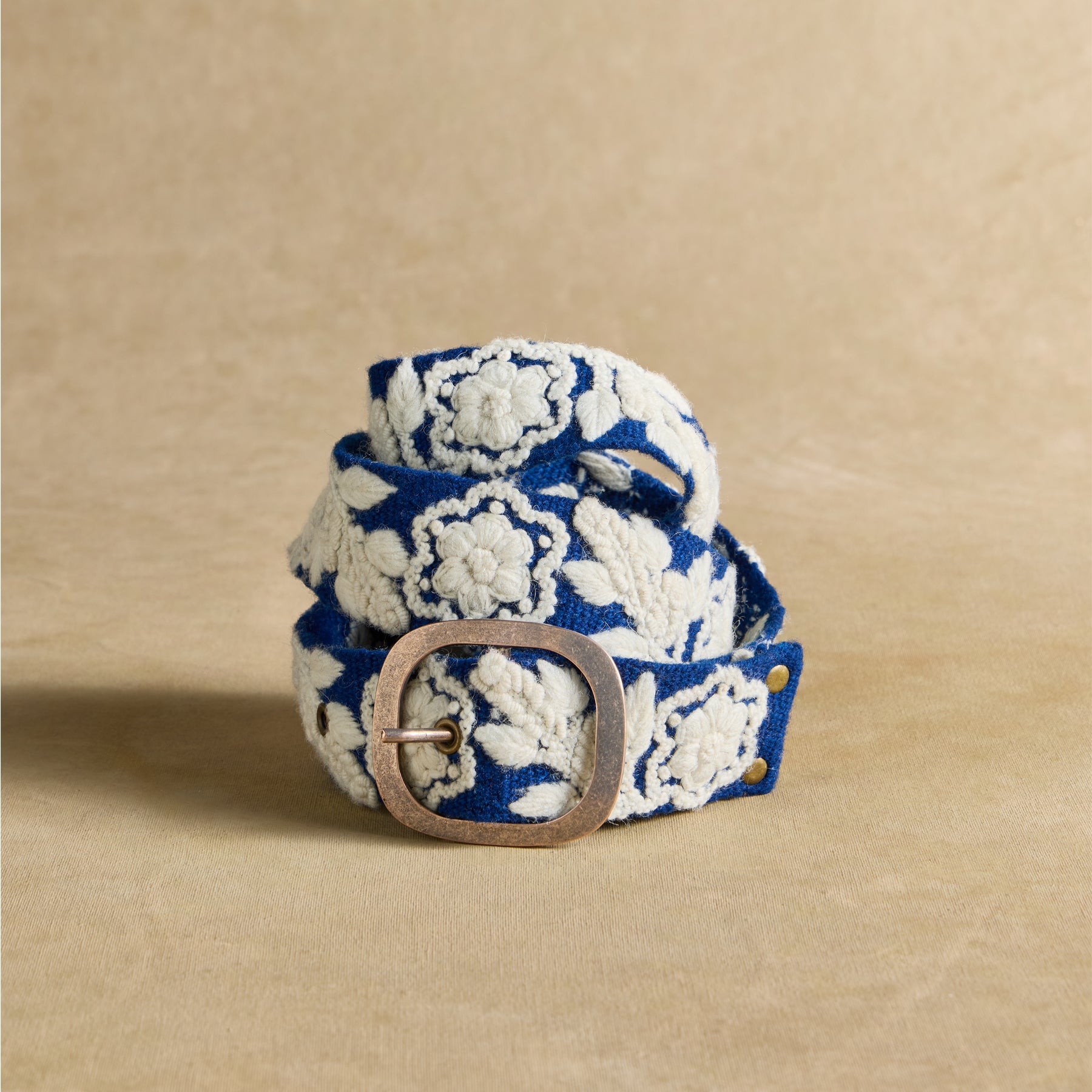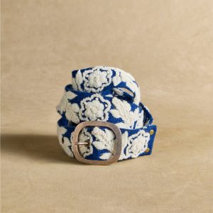 This two-tone wool belt features rich floral embroidery for a simply elegant look. Five sets of holes so the belt can be worn at the hips or the waist. Handcrafted in Peru. Metal buckle. Sizes S (32). M (34). L (36). Approx. 1.78 wide.