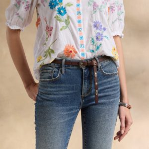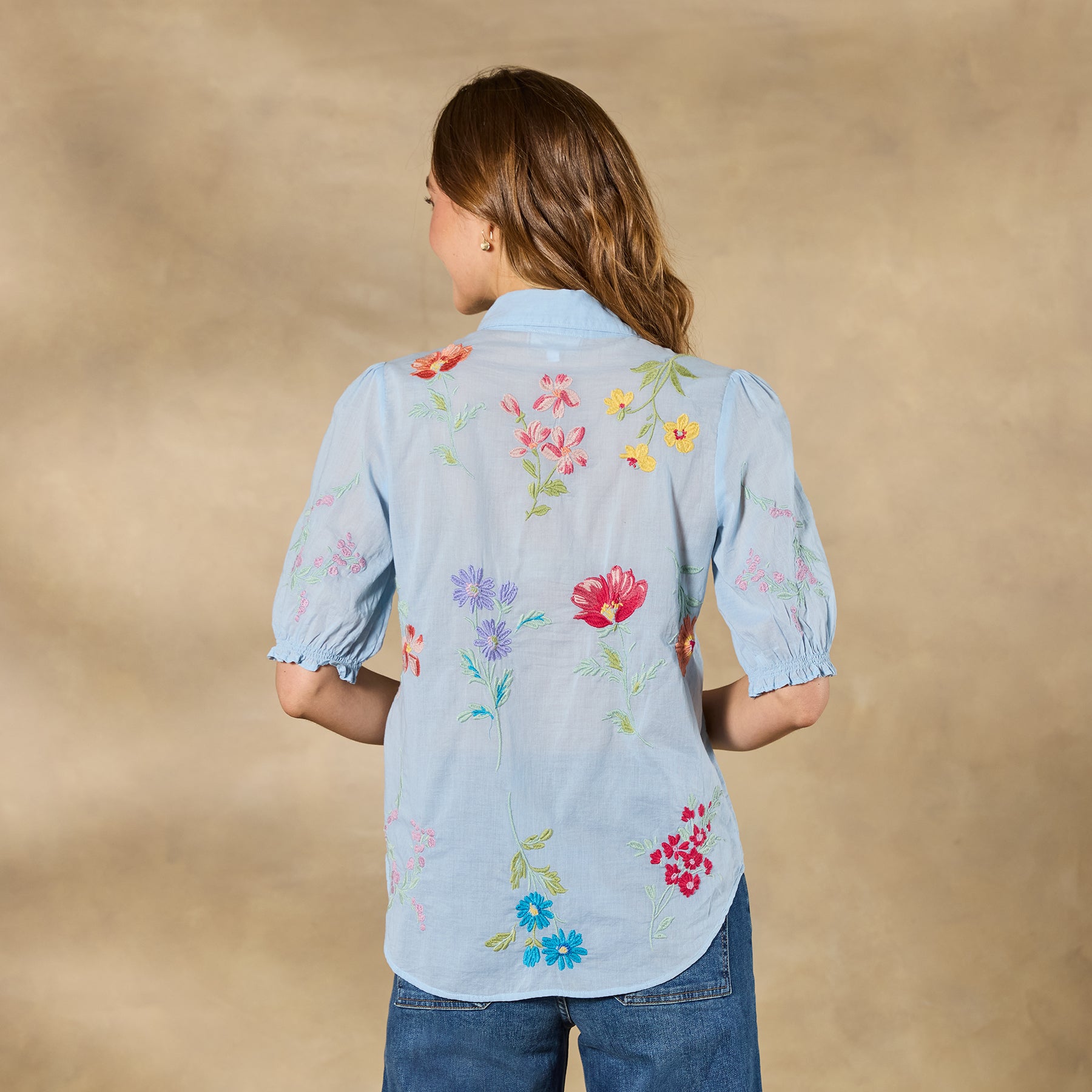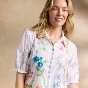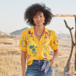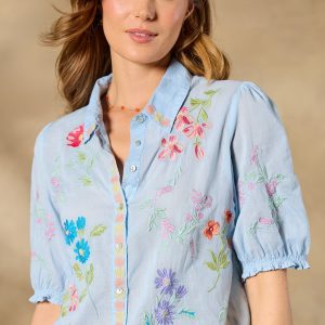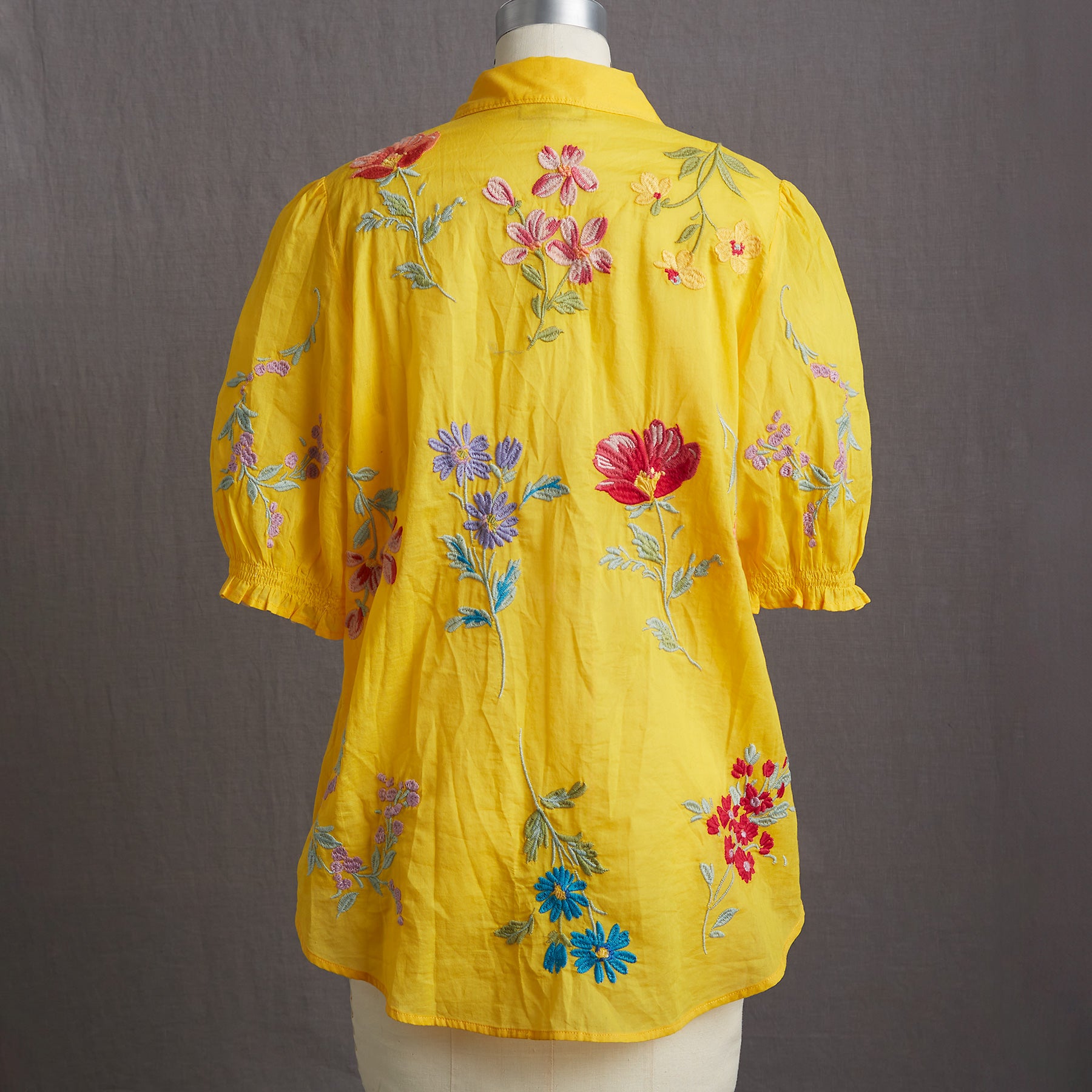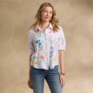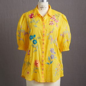 This gorgeous. collared. button-front shirt just exudes happiness with its rich color. allover embroidery. and short blouson sleeves with elastic cuffs and tiny ruffles. Shirttail hem. Cotton. Machine wash. Imported. Sizes XS (4). S (6). M (8??0). L (12). XL (14). XXL (16). Approx. 25.5l.