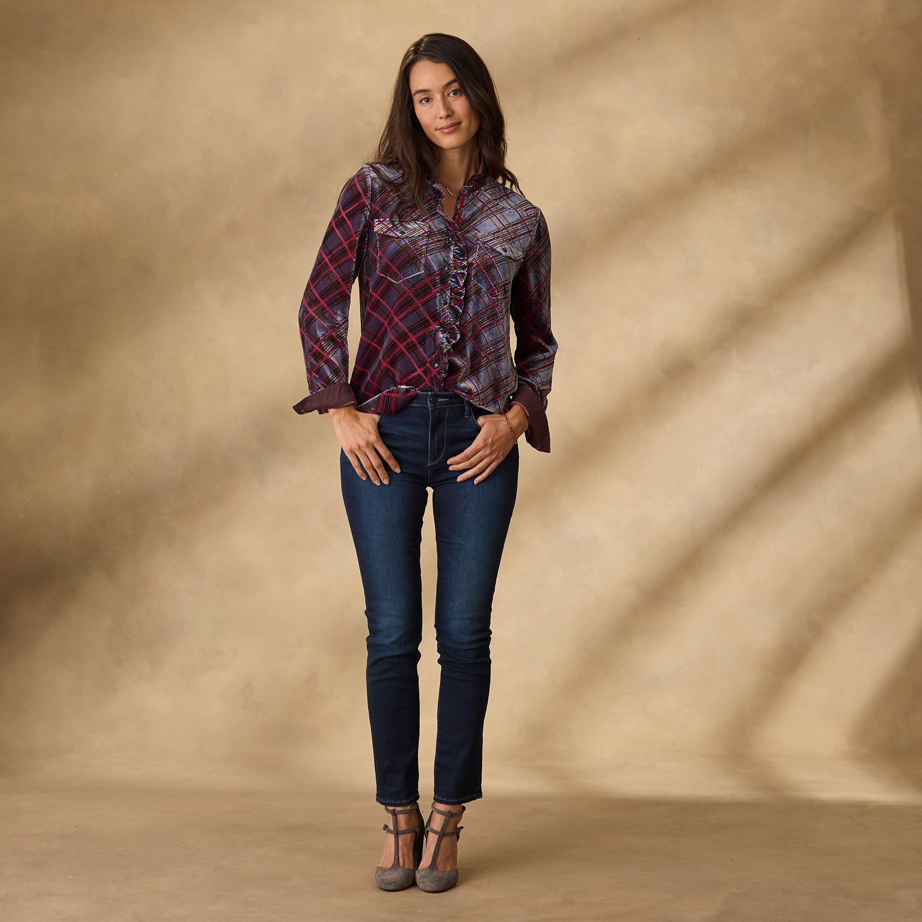 Gretel Plaid Velvet Shirt. Petite