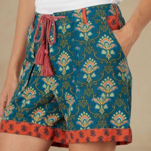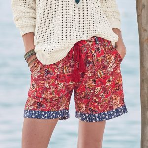 Inspired by Japanese gardens and woodcut designs. these charming shorts feature a nicely weighted linen and cotton in complementary patterns. four pockets and zipper fly with braided. tassel ties and cuffed hems. Machine wash. Imported. Exclusive. Sizes XXS (00). XS (0 to 2). S (4 to 6). M (8 to 10). L (12 to 14). XL (16 to 18). Inseam 4-3/4 rolled. 6 unrolled.