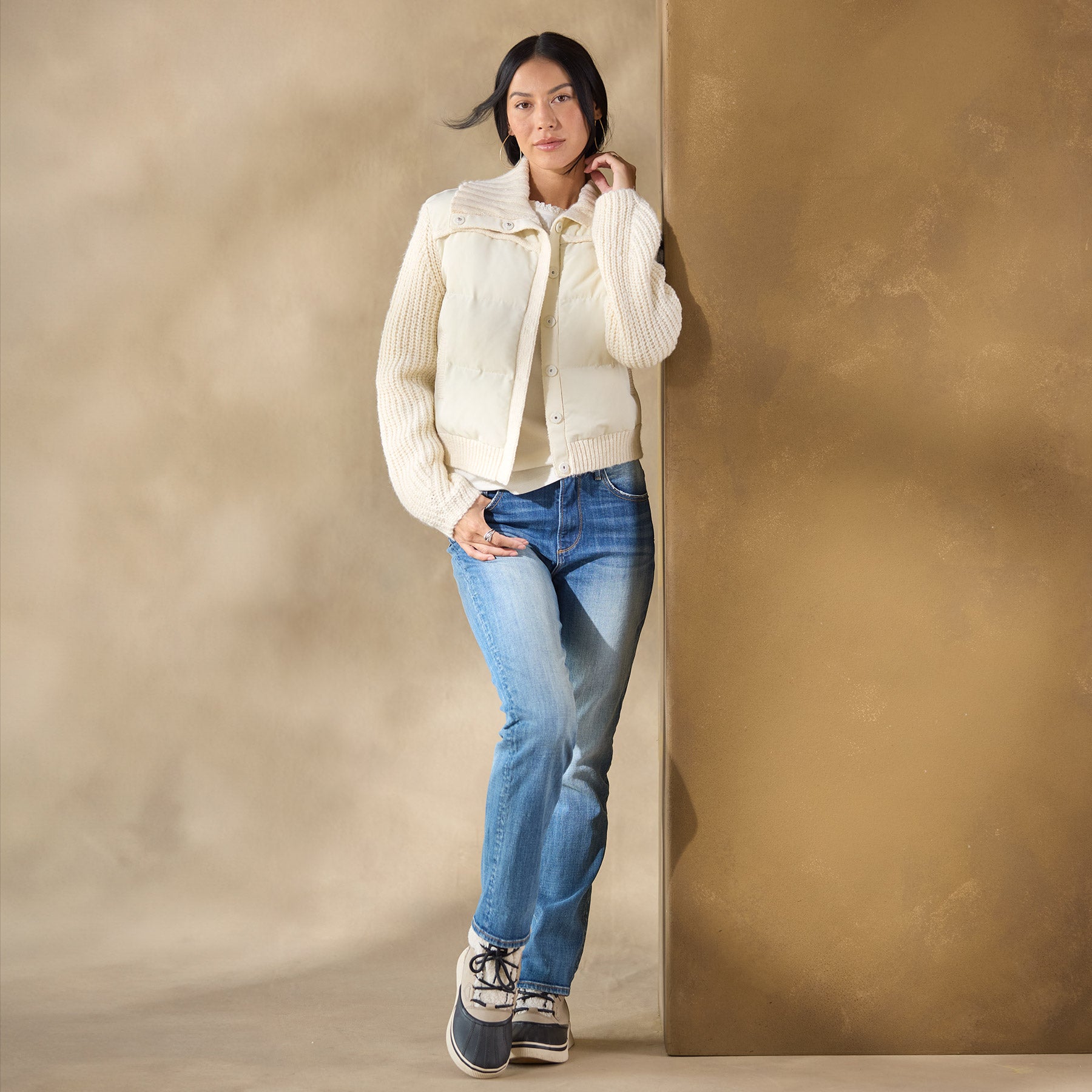 A quilted puffer meets cozy sweater in this delectable. vintage-vibe jacket. The front body and yoke are puffy coat style and the sleeves. trim and back are rib sweater. With button-through mock neck. snap front. exposed seaming and two pockets. Cotton/acrylic/merino wool/alpaca. Hand wash. Imported. Exclusive. Sizes XXS (00). XS (0?C2). S (4?C6). M (8?C10). L (12?C14). XL (16?C18). Approx. 19l.