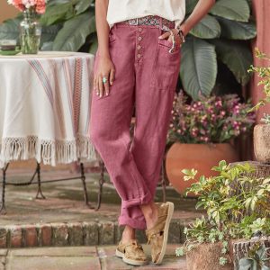 Easy. button fly pants with elastic back. Ladder lace detail. Linen/cotton. Machine wash. Imported. Exclusive. Sizes 2 to 16. 28 inseam.