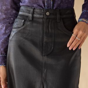 Our stylish oh so easy to wear coated denim skirt takes a classic look and adds a special touch with five pockets. button and zip fly closure and a sophisticated center front slit. Cotton/lycra. Machine wash. Imported. Exclusive. Sizes 24?C32. Approx. 31l.