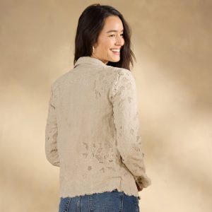 Meet the prettiest piece in your warm-weather wardrobe: Teresa! Shockingly versatile. this tailored lace jacket is a stunner dressed up. over a simple shift??or dressed down with your favorite jeans. All-over embroidered cutwork lace with raw scalloped hem. Welt pockets. Ramie. Machine wash. Imported. Exclusive. Sizes XXS (00). XS (0?C2). S (4?C6). M (8?C10). L (12?C14). XL (16?C18). Approx. 21.5l.