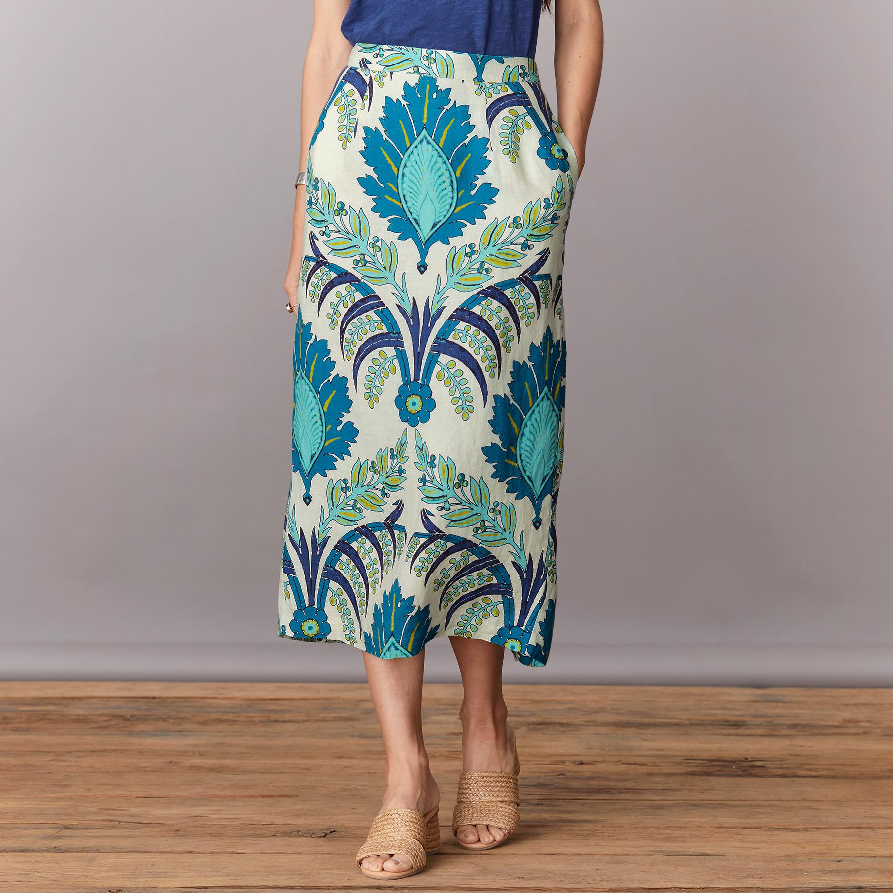 The joy of color. Our stunning engineered print linen pencil skirt is so flattering with side seam pockets. metal zipper at back. elastic at back waistband for comfort. and back slit. Fully lined. Machine wash. Imported. Exclusive. Sizes XS (0?C2). S (4?C6). M (8?C10). L (12?C14). XL (16?C18). XXL (20?C22). Approx. 34l