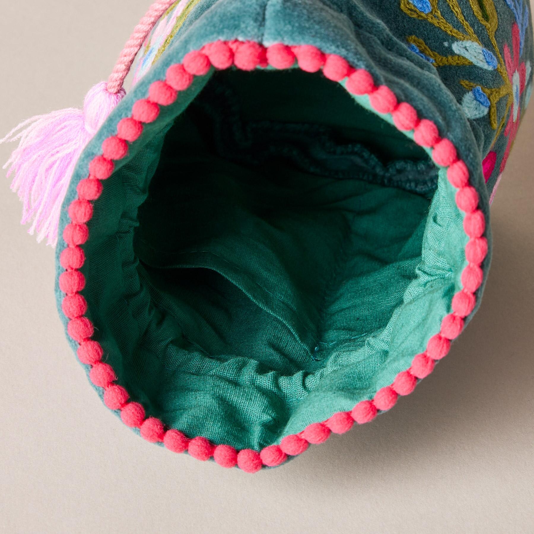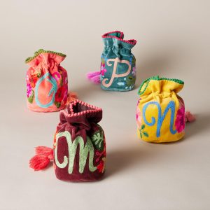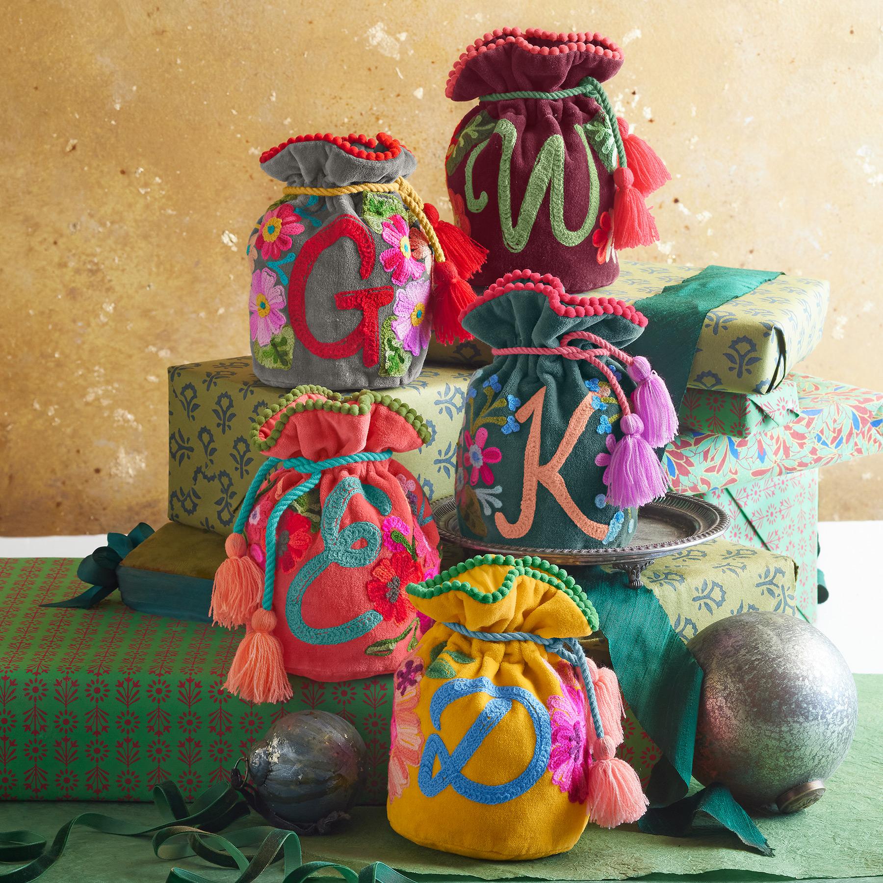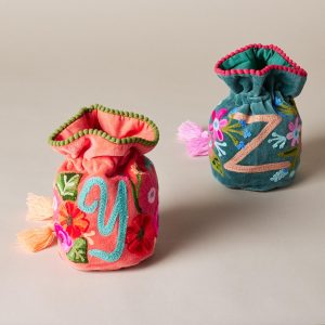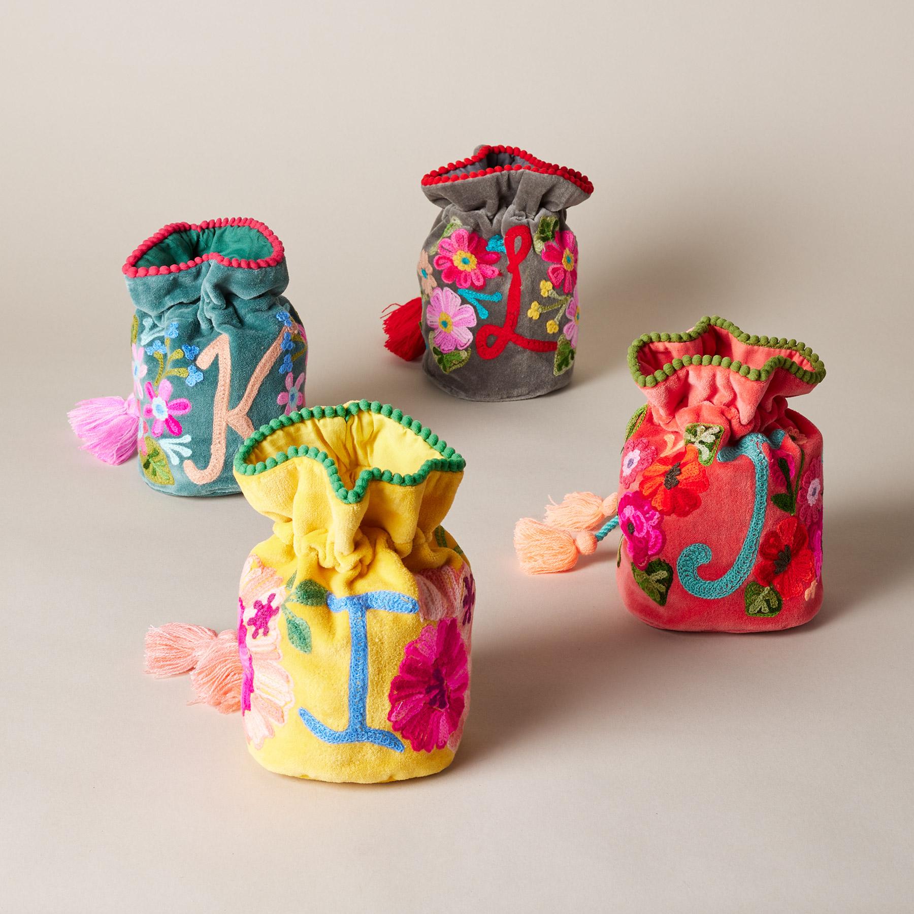Lavishly embroidered. our personalized velvet pouches brighten every day as they keep jewelry protected and organized. Handmade from cotton. with tasseled drawstrings. mini pompom trim and inner slip pockets for rings. studs and other small treasures. Handmade. Exclusive. 6w x 7h.